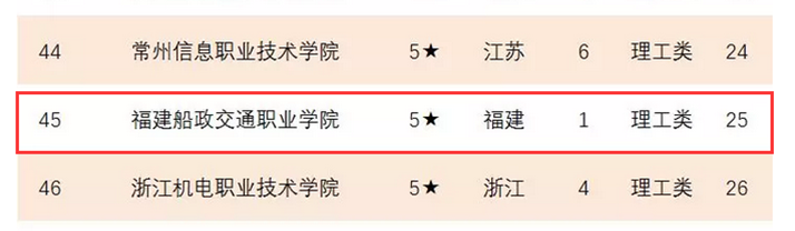 2019年3月28日,第二屆全國高職高專院?!皟?yōu)質(zhì)校”建設(shè)與評價論壇正式發(fā)布了2019年中國高職高專院校競爭力排行榜,福建船政交通職業(yè)學(xué)院獲得5星評價,全國排名第45位,福建省第1。