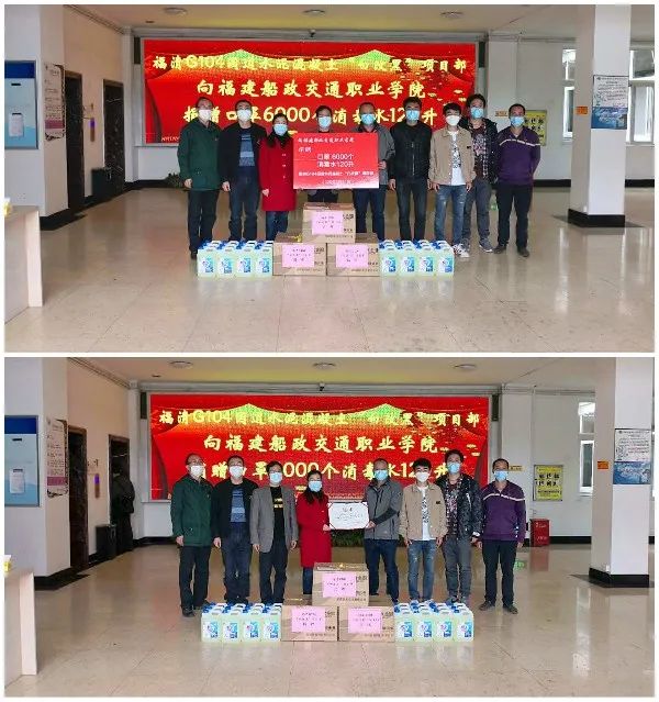 黃育妙校友代表福清G104國道水泥混凝土“白改黑”項目部向?qū)W院捐贈一次性防護(hù)口罩6000個、消毒水120升。