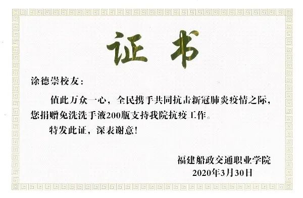 愛心校友涂德崇先生以個人名義向?qū)W院捐贈200瓶免洗洗手液。