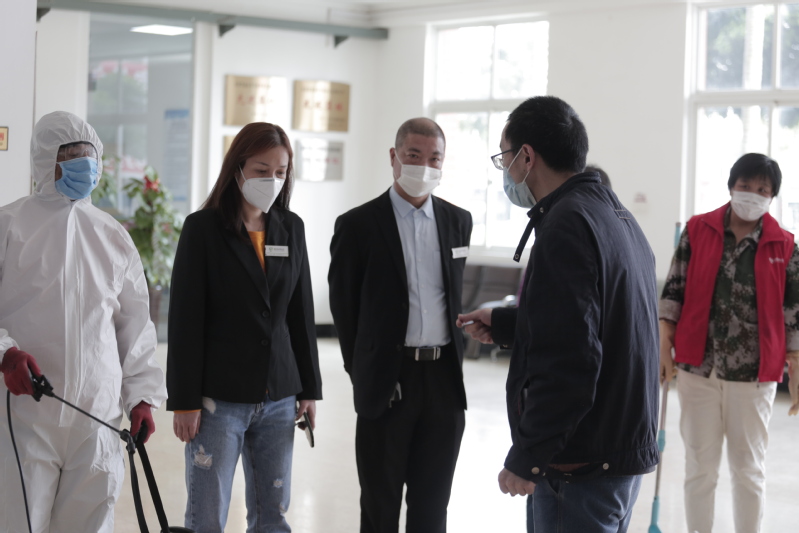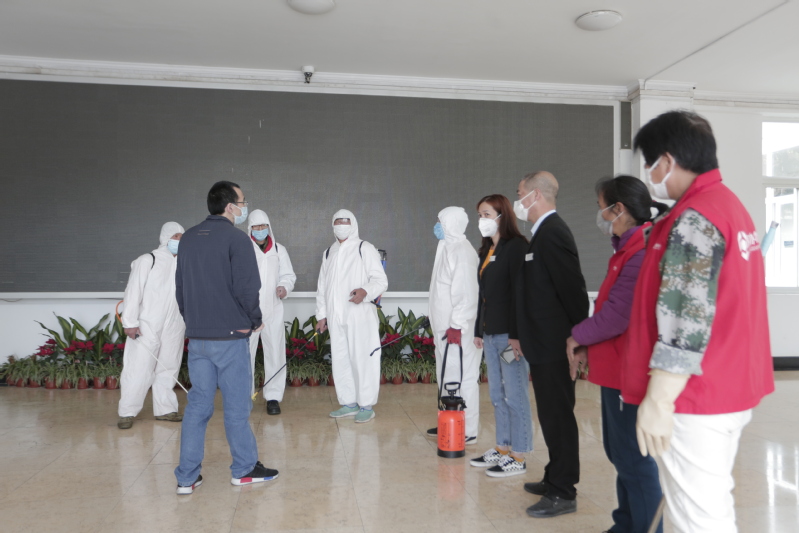 王代榕副主任現(xiàn)場指導(dǎo)物業(yè)人員做好校園辦公樓、教室、食堂等重點(diǎn)場所消殺及消殺注意事項(xiàng)、消殺藥劑的使用和保存等方面工作。