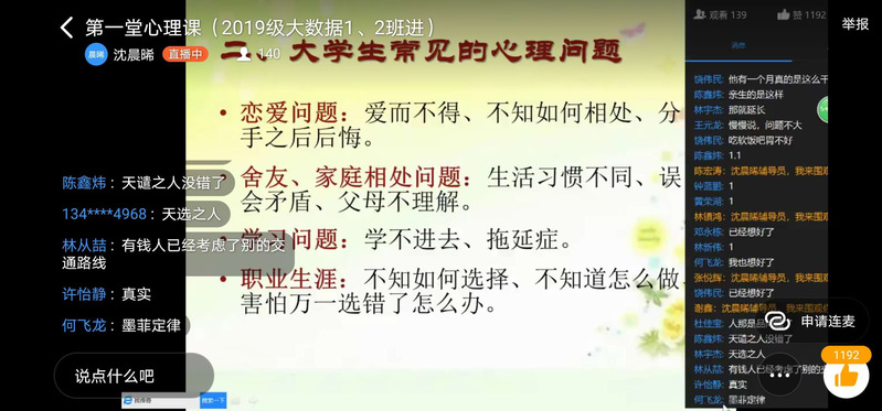 本次主題班會是貫徹落實《關(guān)于針對新型冠狀病毒感染的肺炎疫情開通心理支持熱線和網(wǎng)絡(luò)輔導(dǎo)服務(wù)的通知》要求,由沈晨晞老師利用自己多年從事心理健康教育的知識,采取多種心理教育方式,通過網(wǎng)絡(luò)線上平臺對學(xué)生開展心理健康教育班會,從心理動機、常見心理問題、心理問題處理等方面為切入點,引導(dǎo)學(xué)生如何科學(xué)正確對待疫情生活,認真開展線上學(xué)習(xí),提升自我的心理健康。