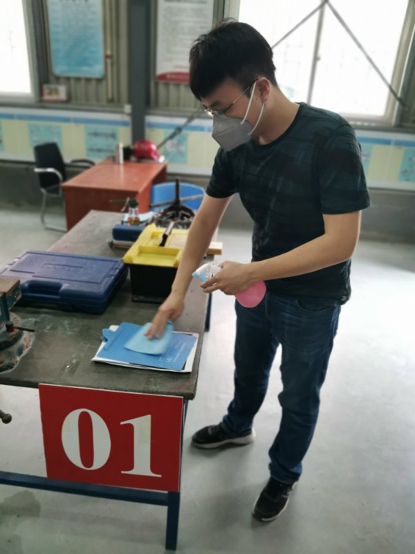 時(shí)值疫情防控的關(guān)鍵時(shí)期,除了完成了布置考試工位,準(zhǔn)備考核用的工量具和技術(shù)資料等工作,我們開(kāi)展了對(duì)考場(chǎng)的衛(wèi)生清掃和設(shè)備消毒工作。
