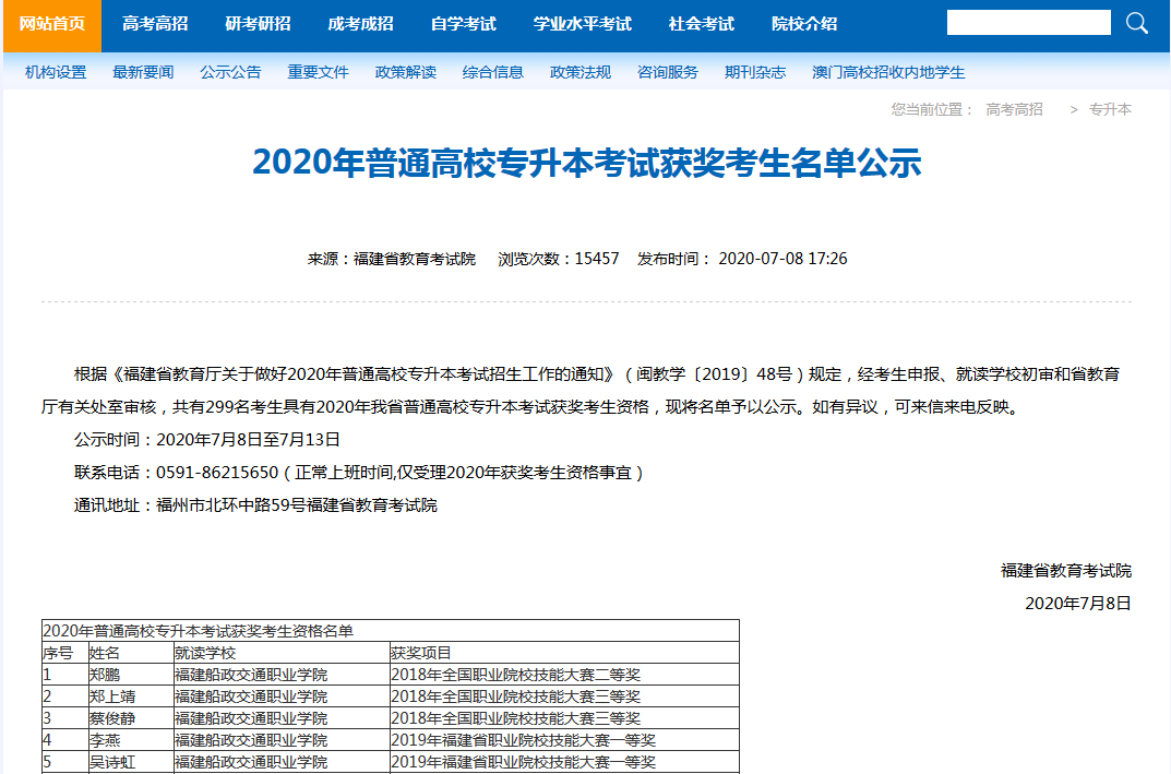 近日,2020年普通高校專升本考試獲獎考生名單已在福建省教育考試院網(wǎng)站上公示,我校49名學子榜上有名,是全省2020年普通高校專升本考試獲獎考生數(shù)最多的高職院校,占全省299名考生具有2020年我省普通高校專升本考試獲獎考生資格的16.39%。