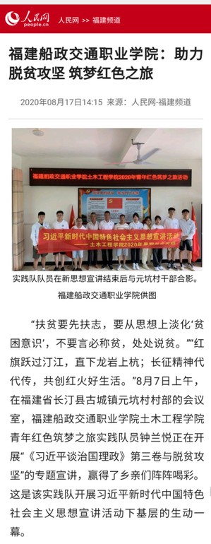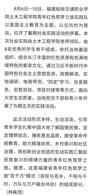 8月6日—10日,福建船政交通職業(yè)學(xué)院土木工程學(xué)院青年紅色筑夢之旅實(shí)踐隊(duì)以愛國主義教育為主題,以元坑村為首站,拉開了暑期社會實(shí)踐活動的序幕。本次社會實(shí)踐由土木工程學(xué)院老師領(lǐng)隊(duì),由8名優(yōu)秀的學(xué)生骨干組成,依托當(dāng)?shù)鼗鶎咏M織,結(jié)合長汀豐富的紅色資源和充滿地域特色的客家文化,通過習(xí)近平新時(shí)代中國特色社會主義思想宣講,政策解讀、實(shí)地調(diào)研、電商帶貨、“四史”學(xué)習(xí)、信息服務(wù)、志智雙扶、項(xiàng)目對接等等方式,面向大學(xué)生志愿者、當(dāng)?shù)攸h員干部和青少年開展了為期五天的實(shí)踐活動。