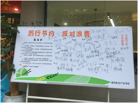 在2018級、2019級學(xué)生返校之際,開展以“厲行節(jié)約,反對浪費(fèi)”承諾墻簽名活動(dòng),通用航空產(chǎn)業(yè)學(xué)院院長陳常暉、黨總支副書記蘇漢美、副院長王顯彬等領(lǐng)導(dǎo)帶頭簽名承諾,師生、食堂員工等紛紛緊隨其后簽名。領(lǐng)導(dǎo)深入學(xué)生食堂與學(xué)生一同用餐,共同實(shí)施“光盤行動(dòng)”,號召同學(xué)們從自身做起、從點(diǎn)滴做起、從身邊做起,自覺養(yǎng)成文明節(jié)儉的消費(fèi)理念和生活習(xí)慣,爭當(dāng)愛糧節(jié)糧模范,努力使“厲行節(jié)約、反對浪費(fèi)”成為新的時(shí)尚風(fēng)向標(biāo)。