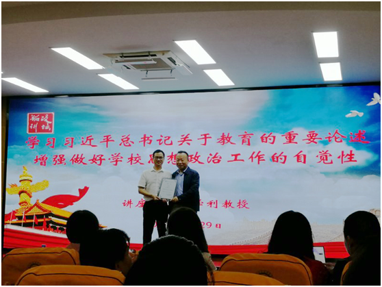 講座中,王教授從習(xí)近平總書記關(guān)于教育的重要論述的核心要義出發(fā),分析了習(xí)近平總書記重要論述的理論支柱,提出了做好思想政治工作要解決根本性的認(rèn)識(shí)問題。他指出,要從習(xí)近平總書記近兩年關(guān)于思想政治工作的論述中,把握高校思想政治工作的趨勢(shì),提高做好工作的自覺性。他從明確思想政治工作的意義、堅(jiān)持社會(huì)主義辦學(xué)原則、提升學(xué)生的思想政治素質(zhì)、發(fā)揮教師關(guān)鍵作用、改革創(chuàng)新構(gòu)建思政工作體系、加強(qiáng)黨的領(lǐng)導(dǎo)幾方面闡述了如何做好思想政治工作,分析透徹、舉例生動(dòng)、深入淺出,吸引了在場(chǎng)聽眾頻頻點(diǎn)頭認(rèn)可。陳宜大副書記為王學(xué)利教授頒發(fā)了特聘教授聘書,希望能保持長(zhǎng)期聯(lián)系,加強(qiáng)交流。