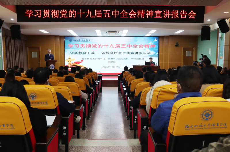 12月14日上午,省委教育工委、省教育廳學(xué)習(xí)貫徹黨的十九屆五中全會(huì)精神宣講報(bào)告會(huì)在我院北校區(qū)一號(hào)樓六樓學(xué)術(shù)報(bào)告廳舉行。省委教育工委、省教育廳“百人宣講團(tuán)”成員、省委教育工委副書記,省教育廳黨組成員、一級(jí)巡視員王建南作宣講報(bào)告。學(xué)院在家領(lǐng)導(dǎo)、副科級(jí)以上干部、兩級(jí)理論學(xué)習(xí)中心組成員、全院正高級(jí)教師、馬克思主義學(xué)院教師、全體輔導(dǎo)員、各黨總支委員及支部委員、各民主黨派支部委員、習(xí)近平新時(shí)代中國(guó)特色社會(huì)主義思想讀書社、船政青年求是社成員等近360余名師生聆聽了宣講報(bào)告。學(xué)院黨委書記張海明主持報(bào)告會(huì)。