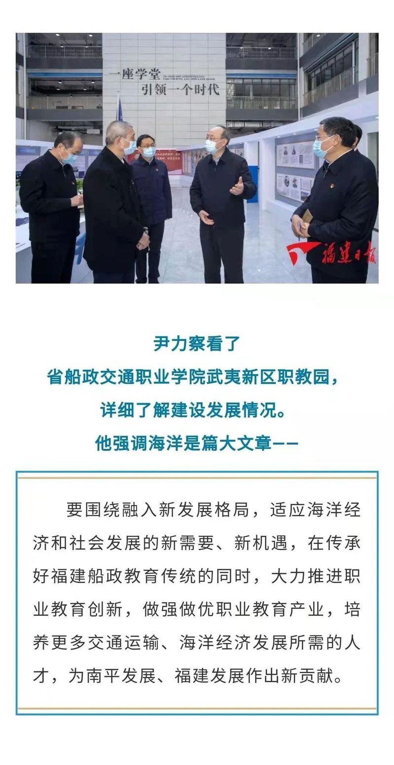 福建省委書記尹力察看我院武夷新區(qū)職教園,張海明書記、陳錦輝院長匯報(bào)了學(xué)院工作,并陪同看望職教園師生。福建新聞聯(lián)播、福建日?qǐng)?bào)對(duì)此進(jìn)行了相關(guān)報(bào)道。
