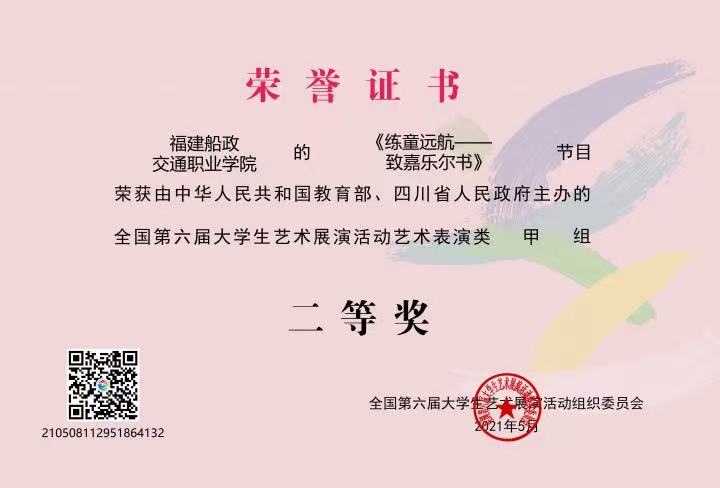 5月6日—5月13日,由教育部、四川省政府共同主辦的全國第六屆大學生藝術展演活動在成都舉行。我院舞蹈《薪傳》在全國630個藝術表演類節(jié)目中脫穎而出,榮獲藝術表演類(舞蹈)甲組一等獎,榮登閉幕式晚會舞臺!朗誦節(jié)目《練童遠航——致嘉樂爾書》榮獲表演類(朗誦)甲組二等獎。