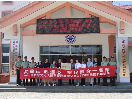 8月29日上午,圖書館黨員代表赴武夷山福建船政交通職業(yè)學(xué)院校外實訓(xùn)基地-新型交通211領(lǐng)創(chuàng)園,開展圖書館文化大篷車援建新型交通211領(lǐng)創(chuàng)園圖書角活動。211領(lǐng)創(chuàng)園相關(guān)負責(zé)人、東部戰(zhàn)區(qū)陸軍軍民融合汽車駕駛培訓(xùn)學(xué)兵營教練員、學(xué)兵代表共同參與了此次活動。