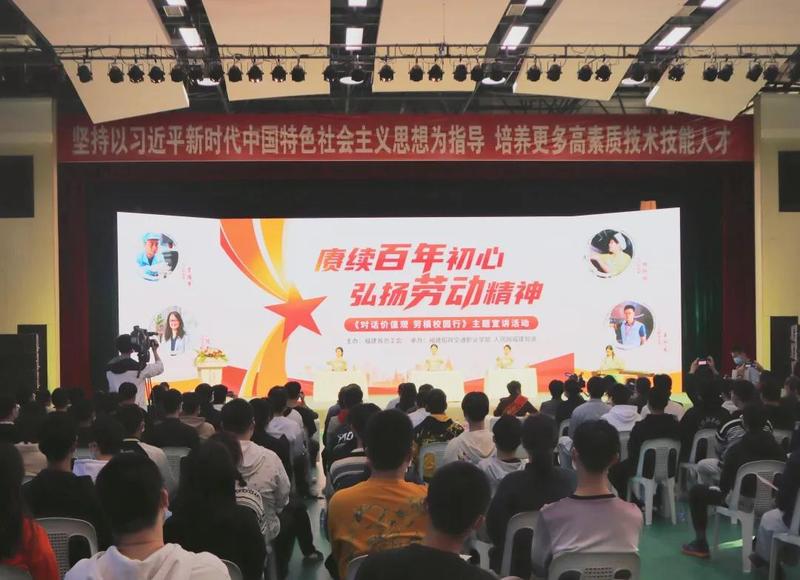 11月10日,由福建省總工會主辦、我院和人民網(wǎng)福建頻道承辦的“對話價值觀 勞模校園行”大型主題宣講活動在我院文體中心隆重舉行。福建省教科文衛(wèi)體工會工委主任郭立新、一級調(diào)研員蘇龍、學(xué)院黨委副書記陳宜大出席活動,學(xué)院相關(guān)部門、各二級學(xué)院負(fù)責(zé)人以及師生代表近300人參加。