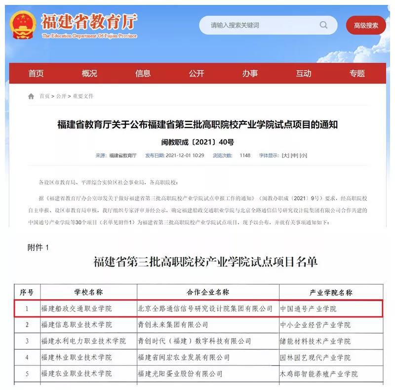 根據(jù)《福建省教育廳關(guān)于公布福建省第三批高職院校產(chǎn)業(yè)學(xué)院試點(diǎn)項(xiàng)目的通知》(閩教職成〔2021〕40號(hào)),福建船政交通職業(yè)學(xué)院與北京全路通信信號(hào)研究設(shè)計(jì)院集團(tuán)有限公司合作建立的中國(guó)通號(hào)產(chǎn)業(yè)學(xué)院成功入選福建省第三批高職院校產(chǎn)業(yè)學(xué)院試點(diǎn)項(xiàng)目,這是福建船政交通職業(yè)學(xué)院堅(jiān)持立德樹(shù)人根本宗旨、落實(shí)產(chǎn)教融合創(chuàng)新發(fā)展的重要成果體現(xiàn)。