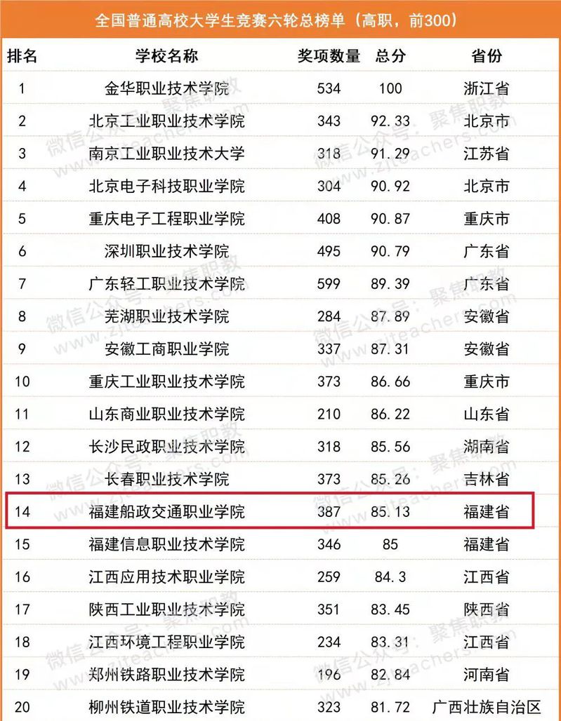 2022年2月22日,中國(guó)高等教育學(xué)會(huì)高校競(jìng)賽評(píng)估與管理體系研究工作組發(fā)布2021全國(guó)普通高校大學(xué)生競(jìng)賽分析報(bào)告,我院排名全國(guó)高校大學(xué)生競(jìng)賽第六輪高職院校總榜單第14,位列福建省排名第一!