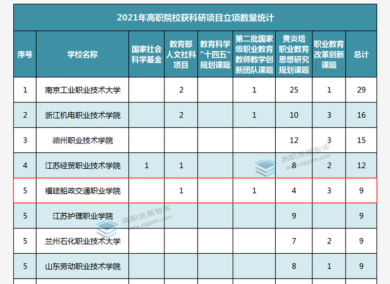 近期,高職發(fā)展智庫對高職院校榮獲國家級科研項(xiàng)目的有效數(shù)據(jù)進(jìn)行統(tǒng)計(jì)與分析,福建船政交通職業(yè)學(xué)院全國排名第五,全省第一!