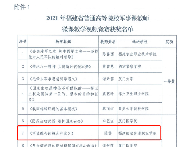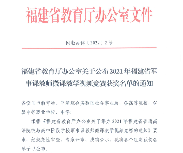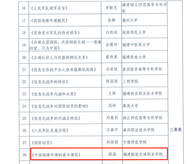 2021年福建省普通高等院校與高中階段學(xué)校軍事課教師微課教學(xué)視頻競賽獲獎名單于日前揭曉,學(xué)院推薦陳雯老師的參賽作品《軍民融合的概念和意義》榮獲二等獎,陳晶老師的參賽作品《中國地緣環(huán)境的基本情況》榮獲三等獎。