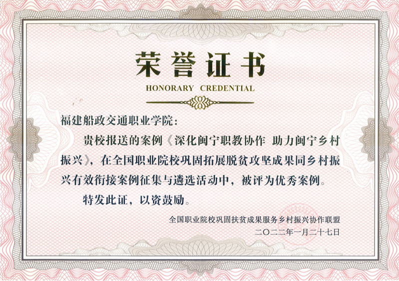 近日,全國職業(yè)院校鞏固扶貧成果服務(wù)鄉(xiāng)村振興協(xié)作聯(lián)盟公布《職業(yè)院校鞏固拓展脫貧攻堅成果同鄉(xiāng)村振興有效銜接優(yōu)秀案例》遴選結(jié)果,我院案例《深化閩寧職教協(xié)作 助力閩寧鄉(xiāng)村振興》入選。