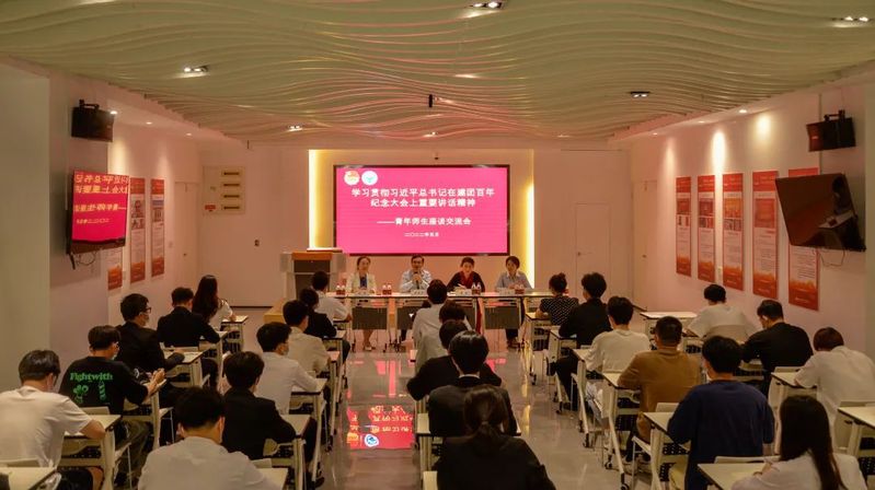 為學(xué)習(xí)貫徹習(xí)近平總書記在慶祝建團(tuán)100周年大會(huì)上的重要講話精神,2022年5月20日下午,學(xué)院團(tuán)委組織召開青年師生座談交流會(huì),青年師生代表們在黨建思政館,再次學(xué)習(xí)習(xí)近平總書記在慶祝建團(tuán)100周年大會(huì)上的重要講話精神,暢談感受、交流學(xué)習(xí)心得。學(xué)院黨委副書記陳宜大、馬克思主義學(xué)院和團(tuán)委相關(guān)人員參加座談。