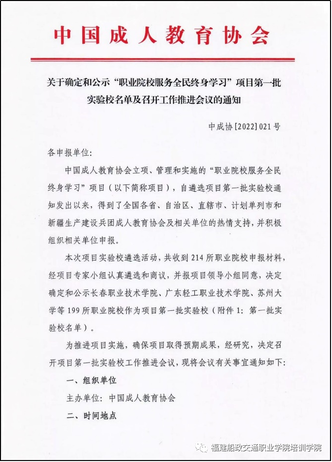 6月10日,中國(guó)成人教育協(xié)會(huì)發(fā)布《關(guān)于確定和公示“職業(yè)院校服務(wù)全民終身學(xué)習(xí)”項(xiàng)目第一批實(shí)驗(yàn)校名單及召開(kāi)工作推進(jìn)會(huì)議的通知》(中成協(xié)〔2022〕21號(hào)),我院榜上有名,成功入選全國(guó)“職業(yè)院校服務(wù)全民終身學(xué)習(xí)”項(xiàng)目首批實(shí)驗(yàn)校。
