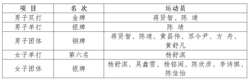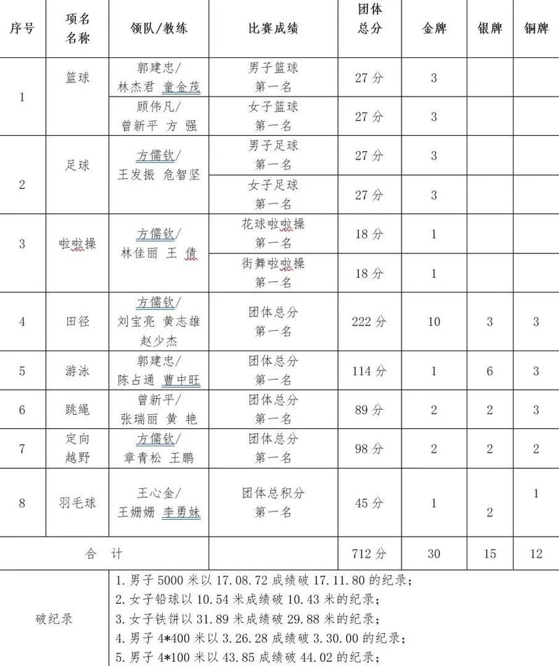 福建船政交通職業(yè)學(xué)院代表團(tuán)獲得:男子籃球冠軍、女子籃球冠軍;男子足球冠軍、女子足球冠軍;花球舞蹈啦啦操冠軍、爵士舞蹈啦啦操冠軍;田徑代表隊(duì)團(tuán)體總分第一名、游泳代表隊(duì)團(tuán)體總分第一名;跳繩代表隊(duì)團(tuán)體總分第一名;定向運(yùn)動(dòng)代表隊(duì)團(tuán)體總分第一名;羽毛球代表隊(duì)團(tuán)體總分第一名。