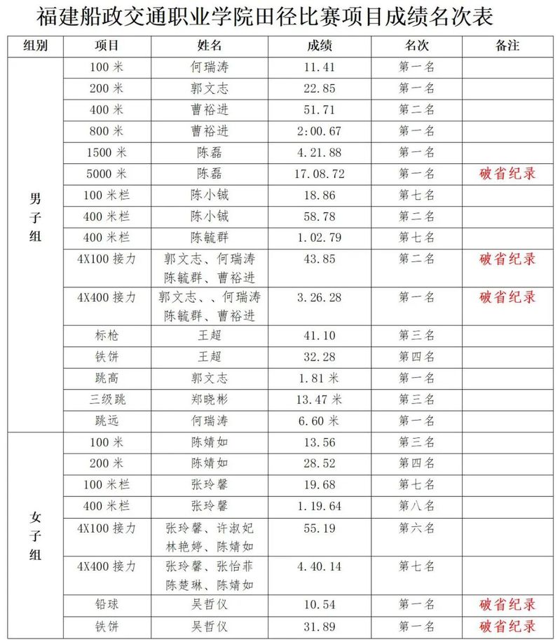 福建省第十七屆運(yùn)動(dòng)會(huì)大學(xué)生部圓滿(mǎn)落幕,福建船政交通職業(yè)學(xué)院代表團(tuán)以712分,30金、15銀、12銅的優(yōu)異成績(jī)獲得團(tuán)體總分第一、金牌數(shù)第一、獎(jiǎng)牌數(shù)第一,并打破5項(xiàng)田徑福建省丙組最高紀(jì)錄!