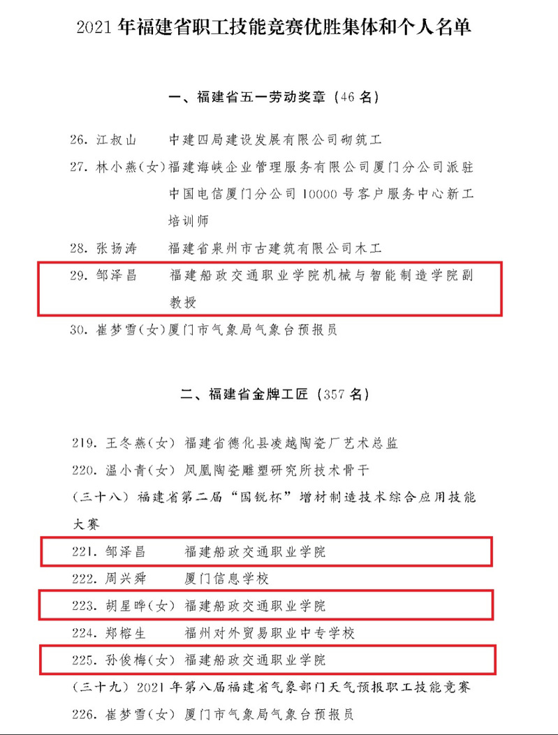 近日,福建省總工會(huì)下發(fā)《關(guān)于表彰2021年全省勞動(dòng)和技能競(jìng)賽優(yōu)勝集體和個(gè)人的決定》(閩工〔2022〕104號(hào)),機(jī)械與智能制造學(xué)院鄒澤昌、胡星曄、孫俊梅榜上有名。鄒澤昌榮獲“福建省五一勞動(dòng)獎(jiǎng)?wù)隆睒s譽(yù)稱號(hào),鄒澤昌、胡星曄、孫俊梅榮獲“福建省金牌工匠”榮譽(yù)稱號(hào)。