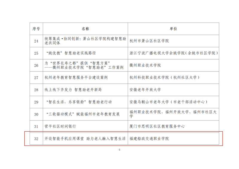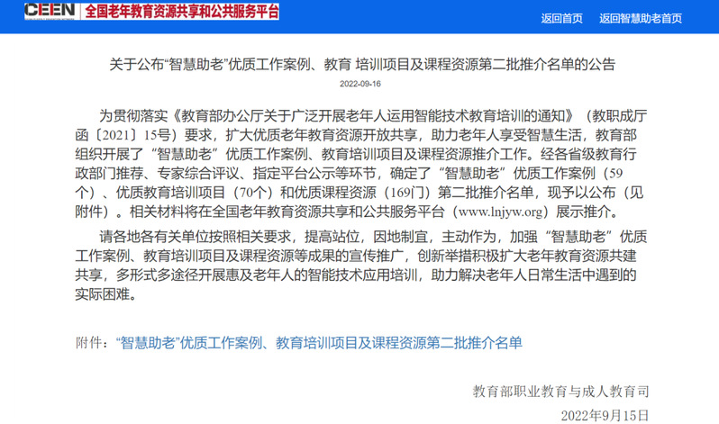 9月15日,教育部職業(yè)教育與成人教育司公布了第二批“智慧助老”優(yōu)質(zhì)工作案例(59個)、優(yōu)質(zhì)教育培訓(xùn)項目(70個)和優(yōu)質(zhì)課程資源(169門),我院《開設(shè)智能手機(jī)應(yīng)用課堂 助力老人融入智慧生活》項目入選為“智慧助老”優(yōu)質(zhì)工作案例,將在全國老年教育資源共享和公共服務(wù)平臺展示推介。
