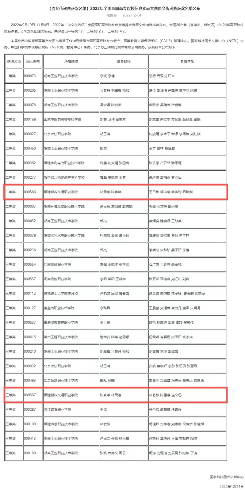 2022年“中文在線杯”全國高職高專院校信息素養(yǎng)大賽原文傳遞賽于9月19日-11月4日成功舉行,來自全國26個?。ㄖ陛犑?、自治區(qū))126所高職院校的276支隊伍參加比賽,我校圖書館組織2支學生團隊參加。
