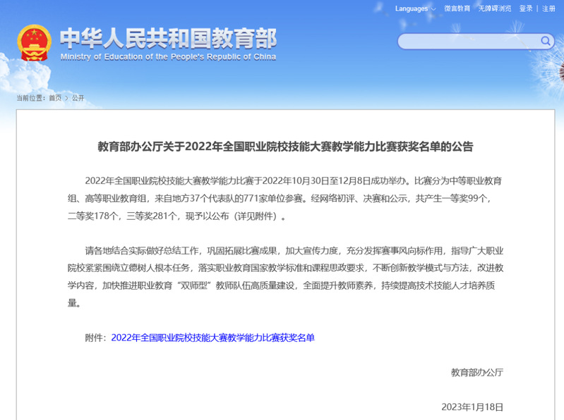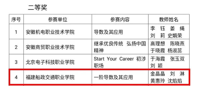1月18日,教育部辦公廳公布由教育部主辦,代表全國職業(yè)院校教學(xué)能力最高水平的權(quán)威賽事--2022年全國職業(yè)院校技能大賽教學(xué)能力比賽獲獎名單。我校通識教育學(xué)院金晶晶、劉淋、黃惠玲、沈焰焰教學(xué)團隊的作品《一階導(dǎo)數(shù)及其應(yīng)用》榮獲二等獎。
