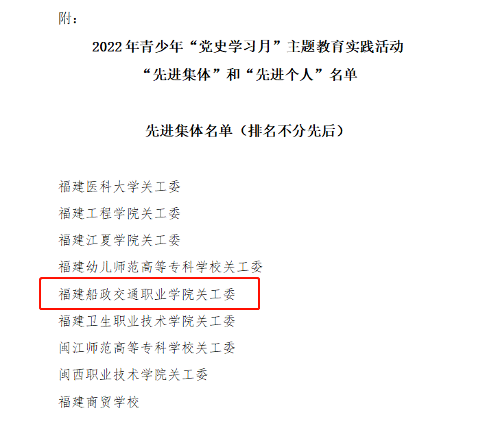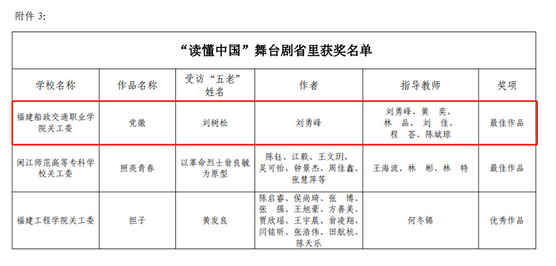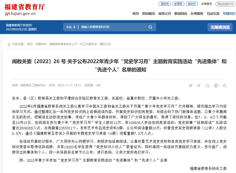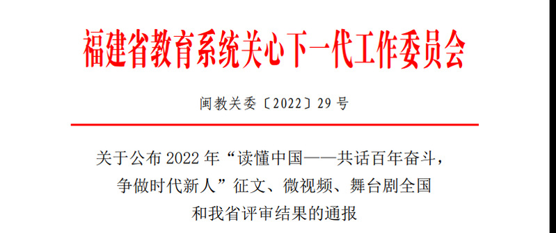 日前,福建省教育系統(tǒng)關(guān)工委公布了2022年《福建教育五老說(shuō)》欄目收看組織工作先進(jìn)集體和先進(jìn)個(gè)人表?yè)P(yáng)名單、2022年青少年“黨史學(xué)習(xí)月”主題教育實(shí)踐活動(dòng)“先進(jìn)集體”和“先進(jìn)個(gè)人”名單以及 2022 年“讀懂中國(guó)——共話百年奮斗, 爭(zhēng)做時(shí)代新人”舞臺(tái)劇評(píng)審結(jié)果,我校關(guān)工委榮獲先進(jìn)集體2個(gè),先進(jìn)個(gè)人1名,舞臺(tái)劇《黨徽》榮獲最佳作品獎(jiǎng)。