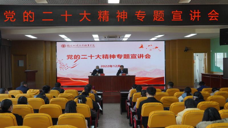 12月23日,為深入學習宣傳貫徹黨的二十大精神,我校黨委書記張海明、校長陳錦輝以《思想偉力領(lǐng)航向,擘畫復興新藍圖》為主題,向師生宣講黨的二十大精神。2022年新提任干部、所在黨支部成員、分管部門成員以及學生代表參加宣講會。