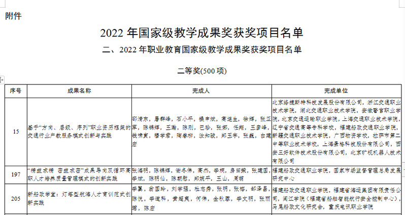 近日,教育部公布了2022年國家級教學(xué)成果獎(jiǎng)獲獎(jiǎng)項(xiàng)目名單。由我校主持申報(bào)的《“精益求精密益求密”成果導(dǎo)向雙循環(huán)高職人才培養(yǎng)質(zhì)量管理模式的創(chuàng)新實(shí)踐》《新船政學(xué)堂:燈塔型航海人才育訓(xùn)范式創(chuàng)新實(shí)踐》等兩個(gè)教學(xué)成果獲得二等獎(jiǎng),我校參與申報(bào)的《基于“方向、層級、序列”職業(yè)資歷框架的交通行業(yè)產(chǎn)教服務(wù)模式創(chuàng)新與實(shí)踐》教學(xué)成果也獲得二等獎(jiǎng)。這是我校繼2018年職業(yè)教育國家級教學(xué)成果獎(jiǎng)獲兩項(xiàng)二等獎(jiǎng)后再獲殊榮。