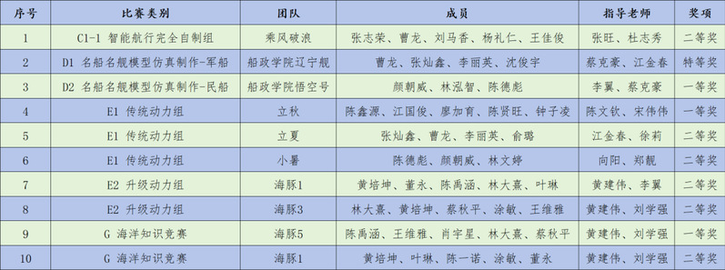在全國海洋航行器大賽賽場上,吸引著來自北京大學(xué)、上海交通大學(xué)、浙江大學(xué)、哈爾濱工業(yè)大學(xué)等371所院校和科研院所的2785支參賽隊伍,覆蓋學(xué)生超萬人。大賽圍繞創(chuàng)新創(chuàng)意創(chuàng)業(yè)、設(shè)計與制作、智慧船舶與海洋工程技術(shù)、名船名艦?zāi)P头抡嬷谱?、船模競速、帆船模型競速、海洋知識競賽七大類比賽項目展開角逐。我校參賽學(xué)生在此次賽事中再創(chuàng)佳績,共獲得特等獎 1 項、一等獎 3 項、二等獎 6 項。