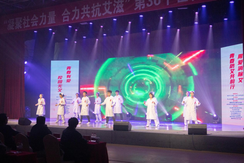 活動(dòng)現(xiàn)場,防艾藝術(shù)展演在學(xué)院主會場隆重舉行,文藝展演內(nèi)容豐富、生動(dòng)有趣,獲得現(xiàn)場師生們陣陣歡呼和掌聲。防艾藝術(shù)展演展示了近年改編的具有深刻教育意義的系列防艾節(jié)目,我院學(xué)生社團(tuán)、校藝術(shù)團(tuán)等帶來精彩節(jié)目。