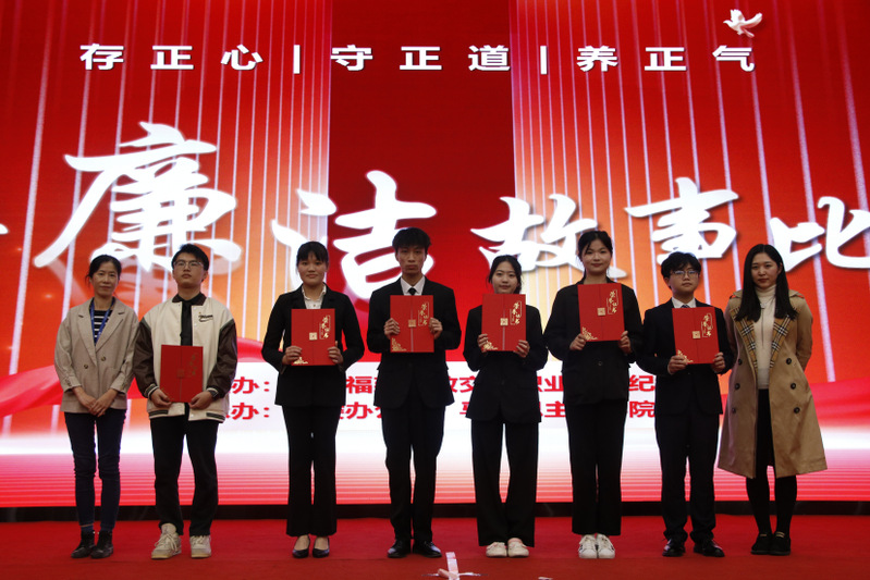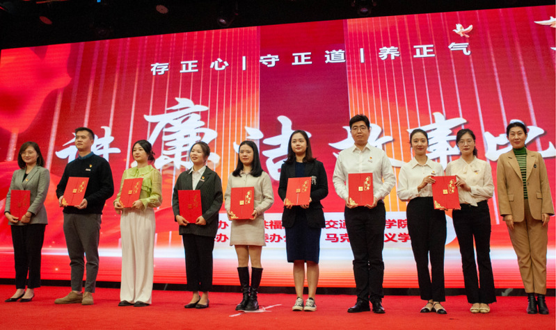 “他是‘立品當(dāng)如山有岳,持身要比玉無瑕’的清廉官員左宗棠?!薄敖乖5撈鸩荨刹?0不準(zhǔn)’是對特權(quán)思想的批評,是對‘權(quán)力任性’的約束?!薄傲疂崗慕蹋T魂育人。三尺講臺(tái),擔(dān)起的是育人之責(zé);支支粉筆,書寫的是師者風(fēng)范。”……14位教師演講者先后上臺(tái),圍繞弘揚(yáng)廉潔精神,講述中國特色的廉潔故事;回溯百年黨史,講述恪守為民的廉潔故事;聚焦船政校史,講述校園廉潔文化建設(shè)的故事。他們以自信大方的臺(tái)風(fēng)、聲情并茂的演講、真摯動(dòng)人的情感贏得現(xiàn)場陣陣掌聲。