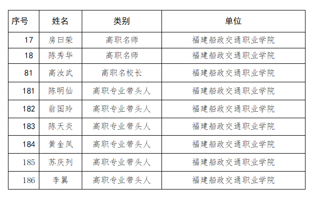 近日,《福建省教育廳關(guān)于公布職業(yè)院校名師名校長和專業(yè)帶頭人名單的通知》(閩教師〔2023〕75號)印發(fā),經(jīng)省教育廳遴選、培養(yǎng)、結(jié)業(yè)考核、專家綜合考評和公示,我院房曰榮、陳秀華被確定為福建省高職院校名師,高汝武被確定為福建省高職院校名校長,陳明仙、翁國玲、陳天炎、黃金鳳、蘇慶列、李翼被確定為福建省高職院校專業(yè)帶頭人。