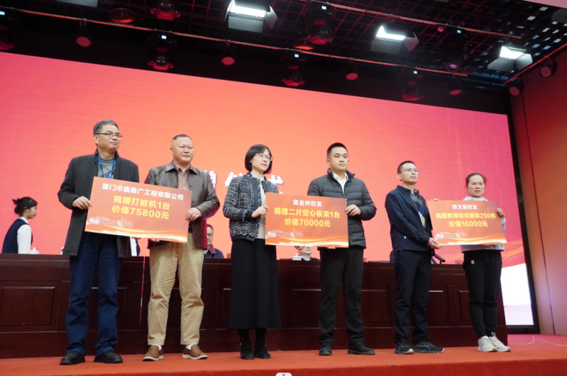 會上,鐘嘉升校友、黃金鐘校友、鄭文振校友分別向?qū)W校捐贈了教學(xué)實訓(xùn)設(shè)備等價值共計14.74萬元。