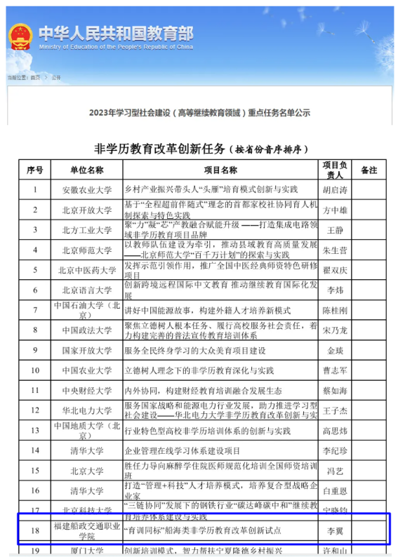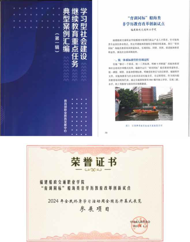 近日,教育部發(fā)布了《2023年學(xué)習(xí)型社會(huì)建設(shè)(高等繼續(xù)教育領(lǐng)域)重點(diǎn)任務(wù)名單》,全國(guó)共有100項(xiàng)學(xué)歷繼續(xù)教育教學(xué)改革創(chuàng)新任務(wù)、100項(xiàng)非學(xué)歷教育改革創(chuàng)新任務(wù)、50項(xiàng)探索三教統(tǒng)籌協(xié)同創(chuàng)新路徑任務(wù)入圍培育建設(shè)名單。由我院航海學(xué)院申報(bào)的《“育訓(xùn)同標(biāo)”船海類非學(xué)歷教育改革創(chuàng)新試點(diǎn)》成功入選非學(xué)歷教育教學(xué)改革創(chuàng)新項(xiàng)目,并作為典型案例在2024年全民終身學(xué)習(xí)活動(dòng)周全國(guó)總開(kāi)幕式上展出。