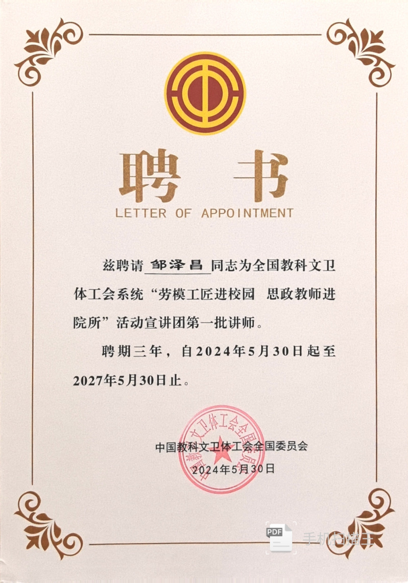 近日,中國(guó)教科文衛(wèi)體工會(huì)全國(guó)委員會(huì)印發(fā)《關(guān)于聘請(qǐng)張茂林等163名同志為全國(guó)教科文衛(wèi)體工會(huì)系統(tǒng)“勞模工匠進(jìn)校園思政教師進(jìn)院所”活動(dòng)宣講團(tuán)第一批講師的決定》,我院鄒澤昌老師被聘為全國(guó)教科文衛(wèi)體工會(huì)系統(tǒng)“勞模工匠進(jìn)校園思政教師進(jìn)院所”活動(dòng)宣講團(tuán)第一批講師。