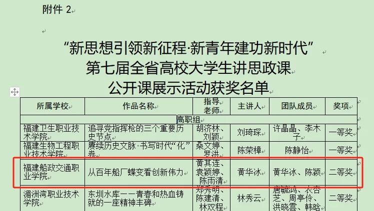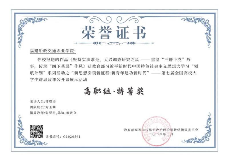 日前,根據(jù)教育部高校思政課教學(xué)指導(dǎo)委員會(huì)和福建省委教育工委的評(píng)審結(jié)果,我院選送的作品《堅(jiān)持實(shí)事求是,大興調(diào)查研究之風(fēng)——重溫“三進(jìn)下黨”故事,傳承“四下基層”作風(fēng)》榮獲第七屆全國(guó)高校大學(xué)生講思政課公開課展示活動(dòng)高職組特等獎(jiǎng),《從百年船廠蝶變看創(chuàng)新偉力》榮獲第七屆全省高校大學(xué)生講思政課公開課展示活動(dòng)高職組二等獎(jiǎng)。