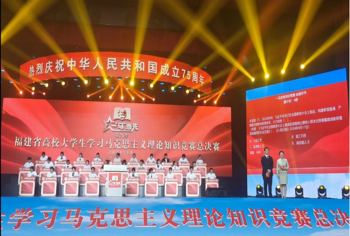 為熱烈慶祝中華人民共和國成立75周年,堅(jiān)持不懈用習(xí)近平新時(shí)代中國特色社會(huì)主義思想鑄魂育人,引導(dǎo)青年學(xué)生立報(bào)國強(qiáng)國大志向、做挺膺擔(dān)當(dāng)奮斗者,9月27日,由中共福建省委教育工委主辦,福建省高校思想政治理論課教學(xué)指導(dǎo)委員會(huì)、福建教育電視臺(tái)承辦的第九季福建省高校大學(xué)生學(xué)習(xí)馬克思主義理論“一‘馬’當(dāng)先”知識(shí)競賽總決賽在福州大學(xué)旗山校區(qū)落下帷幕。我院黨委書記陳宜大攜師生代表參與活動(dòng)觀摩。