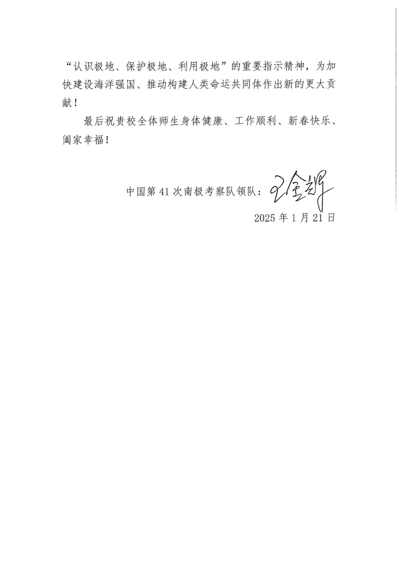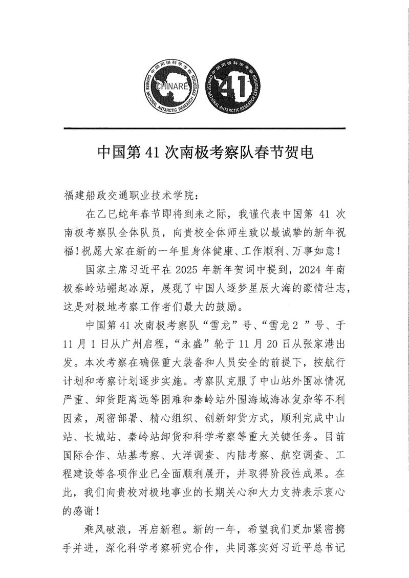 近日,遠(yuǎn)在南極執(zhí)行科學(xué)考察任務(wù)的中國第41次南極考察隊(duì)向我院發(fā)來春節(jié)賀電,感謝我院對極地事業(yè)的長期關(guān)心和大力支持,并向全院師生致以誠摯的節(jié)日問候!