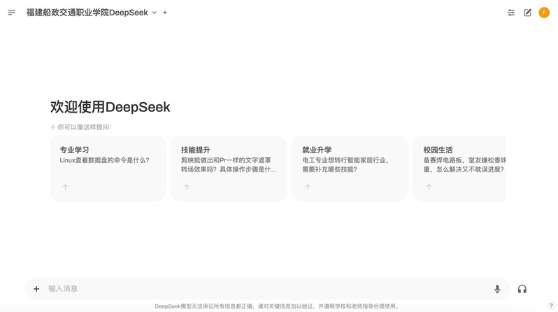 為更好地服務(wù)師生,支持利用人工智能技術(shù)輔助教學(xué)、實(shí)訓(xùn)和自主學(xué)習(xí),DeepSeek-R1模型的本地化部署并試運(yùn)行上線,面向在校師生提供DeepSeek通用問(wèn)答平臺(tái)服務(wù)。該平臺(tái)不僅為教師提供了高效的教學(xué)輔助工具,還為學(xué)生提供了智能化的學(xué)習(xí)體驗(yàn)。