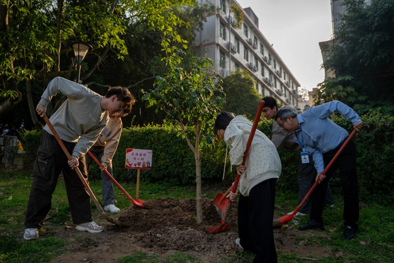 最后,在“一站式”學生社區(qū)“開心農場”勞動實踐基地,陳常暉副院長與少數民族學生共同種下“民族團結同心樹”。