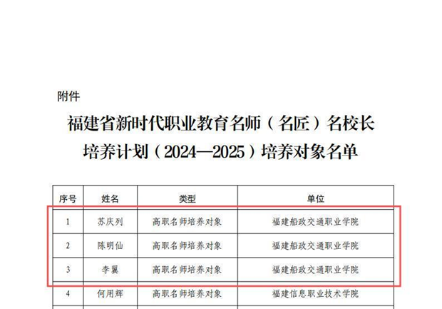根據(jù)《福建省教育廳關(guān)于公布福建省新時代職業(yè)教育名師(名匠)名校長培養(yǎng)計劃(2024-2025)培養(yǎng)對象名單的通知》,我院?蘇慶列?、?陳明仙?、?李翼?三位教師成功入選福建省高職院校名師培養(yǎng)對象?。
