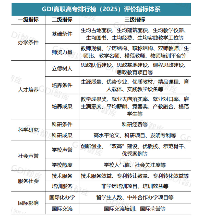 據(jù)悉,GDI智庫(kù)發(fā)布榜單以教育部最新一次公布的《全國(guó)普通高等學(xué)校名單》為依據(jù),設(shè)置辦學(xué)條件、人才培養(yǎng)、科學(xué)研究、社會(huì)聲譽(yù)、服務(wù)社會(huì)和國(guó)際影響等6個(gè)一級(jí)指標(biāo),下設(shè)師資力量、培養(yǎng)成果、科研成果、學(xué)校聲譽(yù)、技術(shù)服務(wù)、培訓(xùn)服務(wù)等13個(gè)二級(jí)指標(biāo)以及150多個(gè)細(xì)分指標(biāo),全面、客觀地對(duì)高職院校發(fā)展現(xiàn)狀作出科學(xué)評(píng)價(jià)。