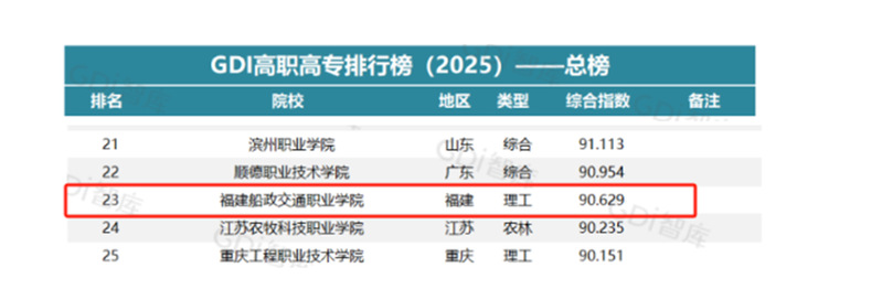 近日,GDI智庫(kù)發(fā)布“GDI高職高專排行榜(2025)”,對(duì)全國(guó)1560所高職院校(不含香港特別行政區(qū)、澳門特別行政區(qū)和臺(tái)灣地區(qū)院校)進(jìn)行科學(xué)評(píng)價(jià)。我院綜合排名位列總榜第23位,省內(nèi)綜合排名位列第一。