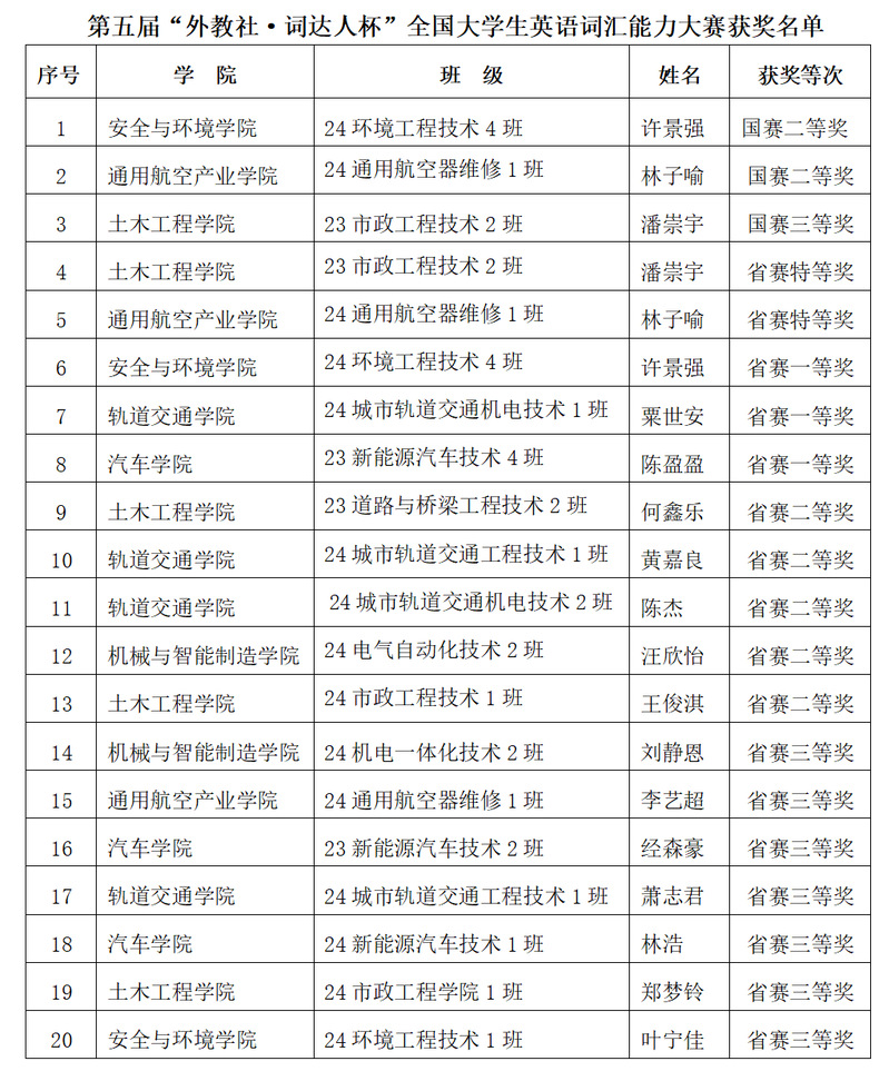 我院共有622名學(xué)生報(bào)名參賽,其中63名學(xué)生晉級省賽,17名學(xué)生在省賽中獲獎。經(jīng)過激烈角逐,我院5名學(xué)生晉級國賽,其中,24環(huán)境工程技術(shù)4班許景強(qiáng)、24通用航空器維修1班林子喻榮獲國賽二等獎,23市政工程技術(shù)2班潘崇宇榮獲國賽三等獎。
