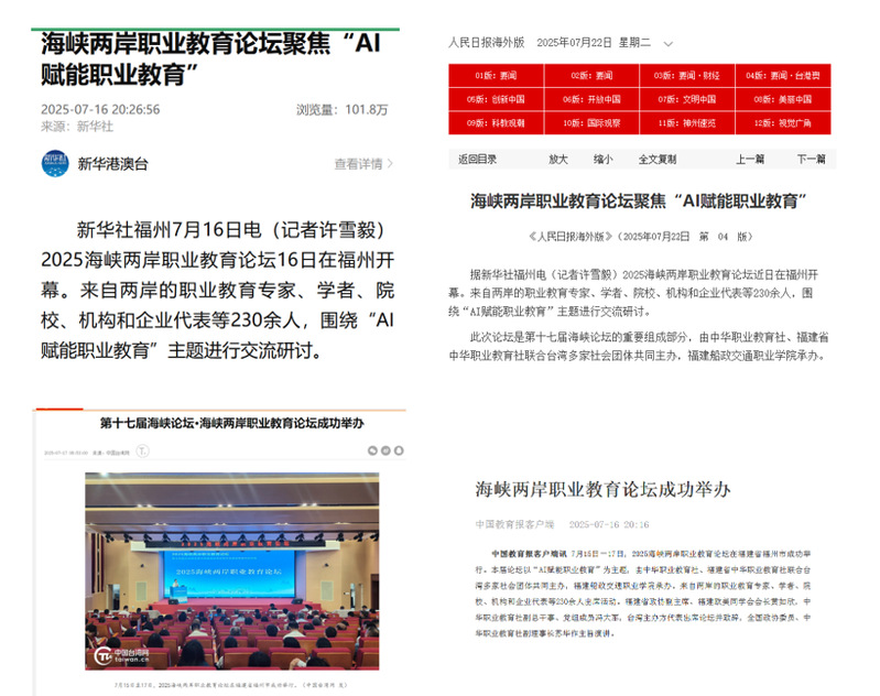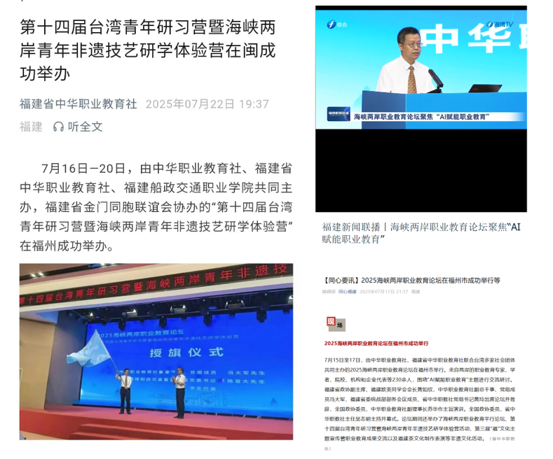 7月15日-17日,2025海峽兩岸職業(yè)教育論壇在福建省福州市成功舉行。此次論壇以“AI賦能職業(yè)教育”為主題,由中華職業(yè)教育社、福建省中華職業(yè)教育社聯(lián)合臺灣多家社會團體共同主辦,福建船政交通職業(yè)學院承辦,《教育與職業(yè)》雜志社協(xié)辦。論壇期間,第十四屆臺灣青年研習營暨海峽兩岸青年非遺技藝研學體驗營同步舉辦。本次論壇獲得了新華社、人民網(wǎng)、中國臺灣網(wǎng)、中國教育報、經(jīng)濟日報、中國新聞網(wǎng)、中華職業(yè)教育社、福建省中華職業(yè)教育社、福建電視臺、同心福建等十多家主流媒體報道。