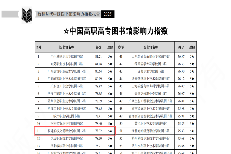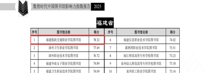近日,武漢大學(xué)中國科學(xué)評價研究中心、數(shù)字出版智能服務(wù)技術(shù)教育部工程研究中心研究的《數(shù)智時代中國圖書館影響力指數(shù)報告(2025版)》正式發(fā)布。該報告對我國2919所普通高校圖書館(含1275所本科院校圖書館及1545所高職(專科)院校圖書館)、1980家公共圖書館和390家專業(yè)圖書館進(jìn)行評價(不含港澳臺地區(qū)圖書館),并從多維度產(chǎn)生多個排行榜。福建船政交通職業(yè)學(xué)院圖書館在2025年“中國高職高專圖書館影響力總排行榜”中,位列全國高職高專院校第11位、福建省高職高專院校第1位。