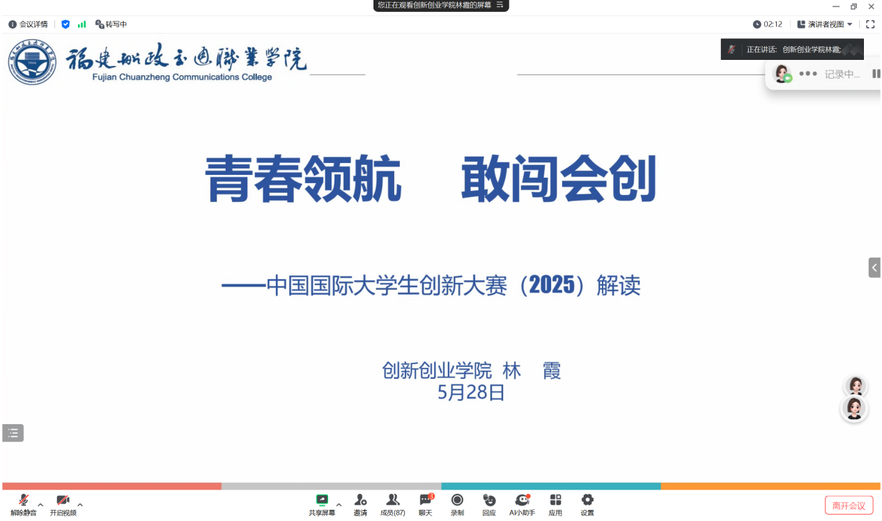 5月28日晚,我校通過(guò)騰訊會(huì)議舉辦中國(guó)國(guó)際大學(xué)生創(chuàng)新大賽(2025)專題講座,由創(chuàng)新創(chuàng)業(yè)學(xué)院林霞院長(zhǎng)主講,100余名參賽師生聽(tīng)取講座。